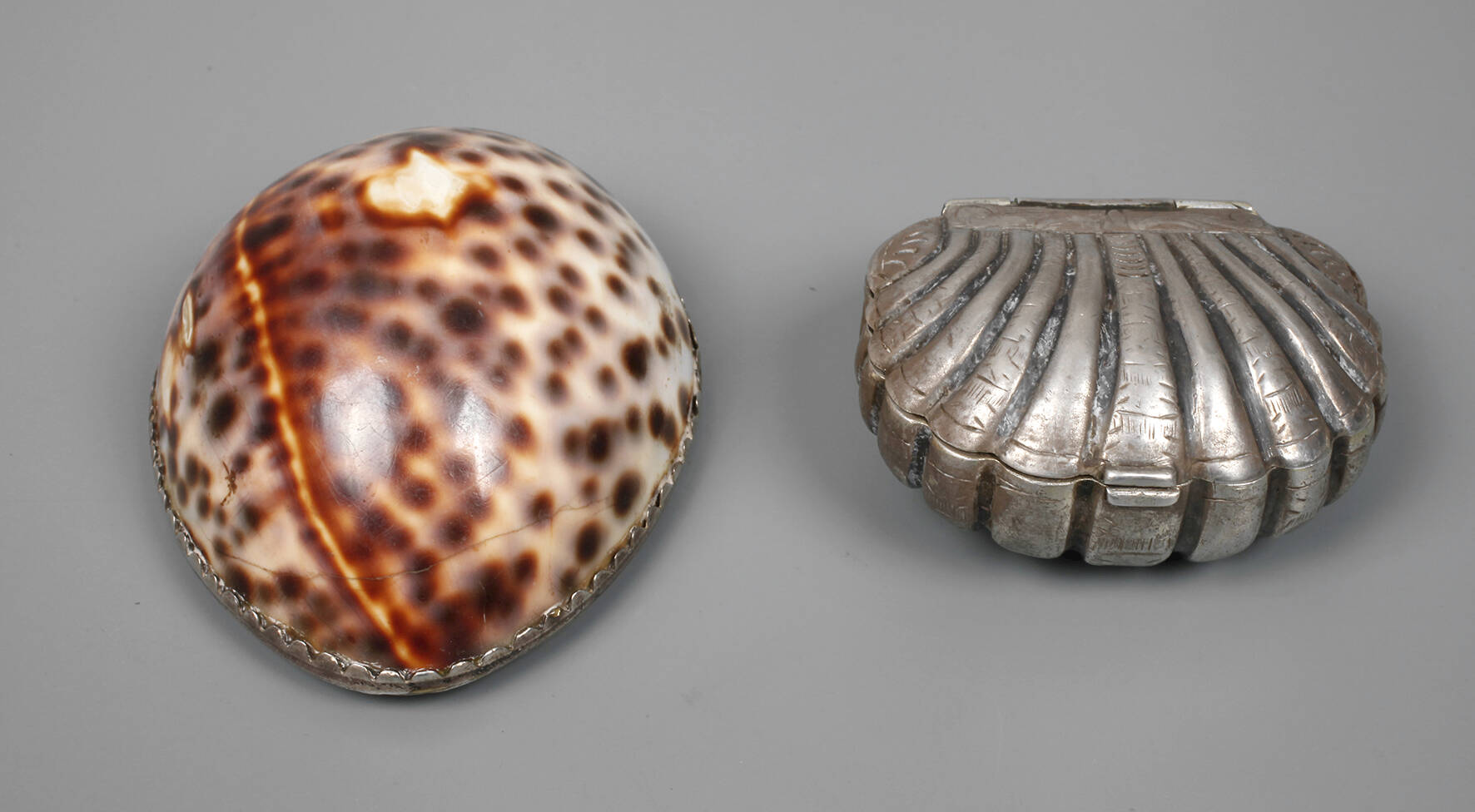 eine Schweden, Kauri-Tigerschnecke mit Silbermontierung, gestempelt mit drei Kronen und weiterer unleserlicher Punze und Hersteller GNR?, scharnierter Klappdeckel mit graviertem Besitzermonogramm SMS im Blattkranz, die andere Silber, innen vergoldet, mit Herstellerpunze PS, wohl Schwäbisch Gmünd, altersgemäßer Zustand, L 6 und 7 cm, G total ca. 93 g.