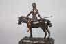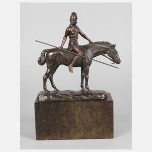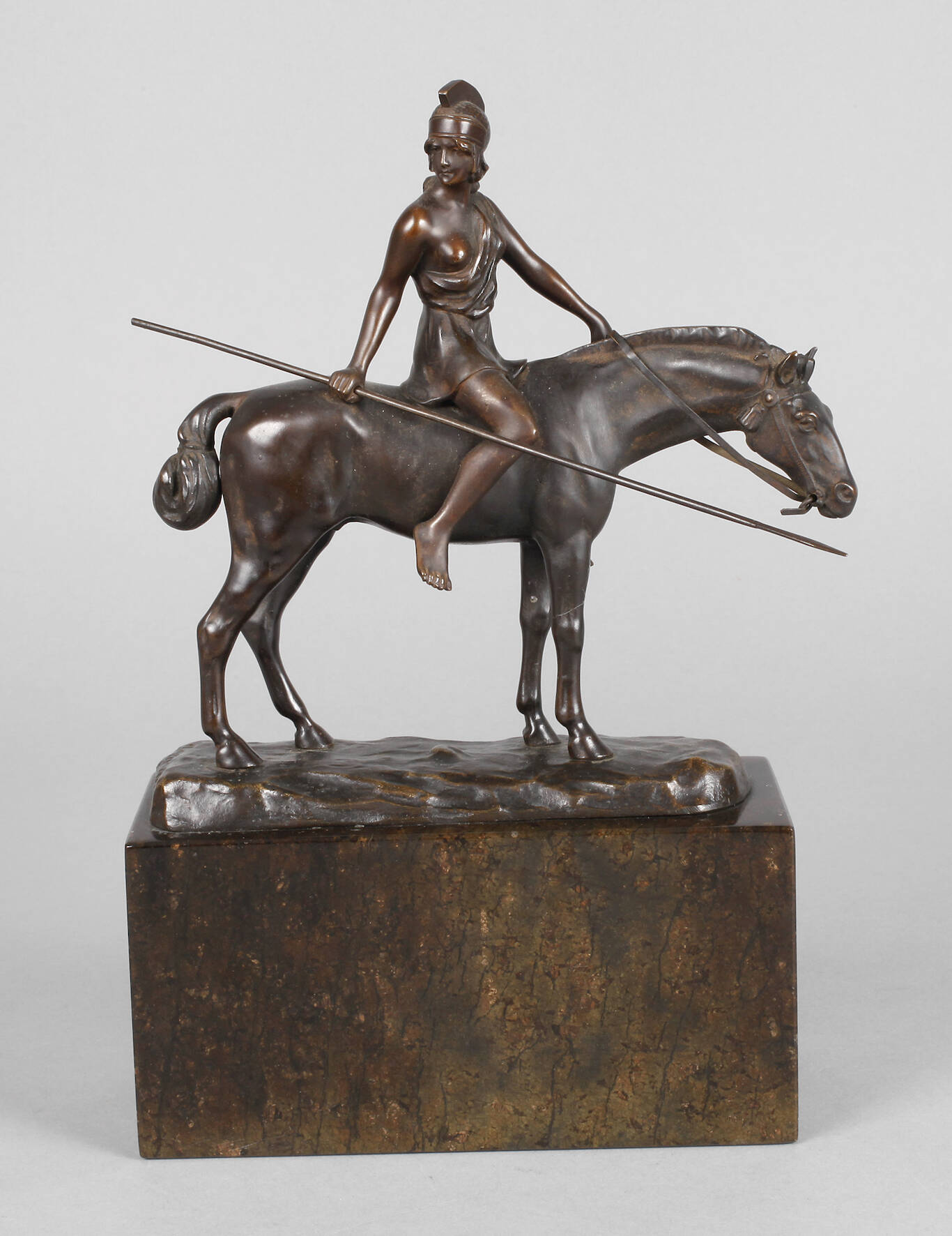 um 1910, signiert, Bronze dunkel patiniert, erotische Darstellung einer kriegerischen jungen Frau, mit römisch anmutendem Helm und Speer, auf dem nackten Rücken ihres Pferdes sitzend, auf naturalistisch gestalteter Plinthe, auf hohem Serpentinsockel, gute altersgemäße Erhaltung, H Bronze ca. 18 cm, H gesamt ca. 26 cm. Künstlerinfo: deutscher Bildhauer, tätig um 1900, Quelle: Internet.