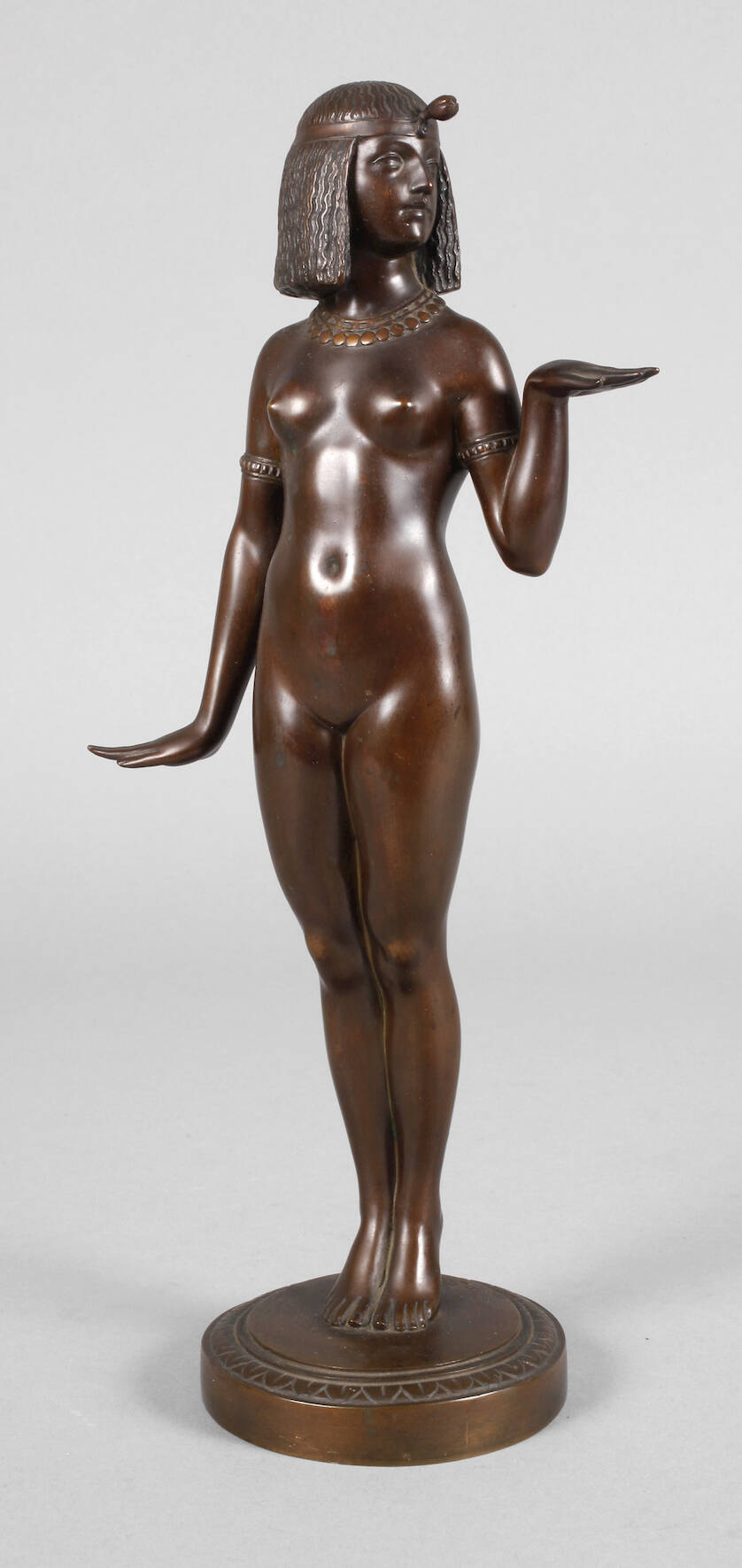 um 1900, auf der Plinthe signiert, Bronze dunkelbraun patiniert, Ägypterin als Akt, geschmückt mit Armreifen, Kette sowie Diadem, auf runder, ornamental verzierter Plinthe, gute Erhaltung mit winzigen Altersspuren, H ca. 33,5 cm. Künstlerinfo: deutscher Bildhauer (1854 Sigmaringen bis 1932 München), lernte als Altarbauer in Sigmaringen, ab 1874 in München, arbeitete dort unter anderem bei Phil. Perron, besuchte 1886/90 die Münchner Akademie. Quelle: Thieme-Becker.