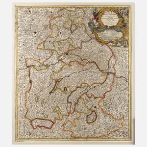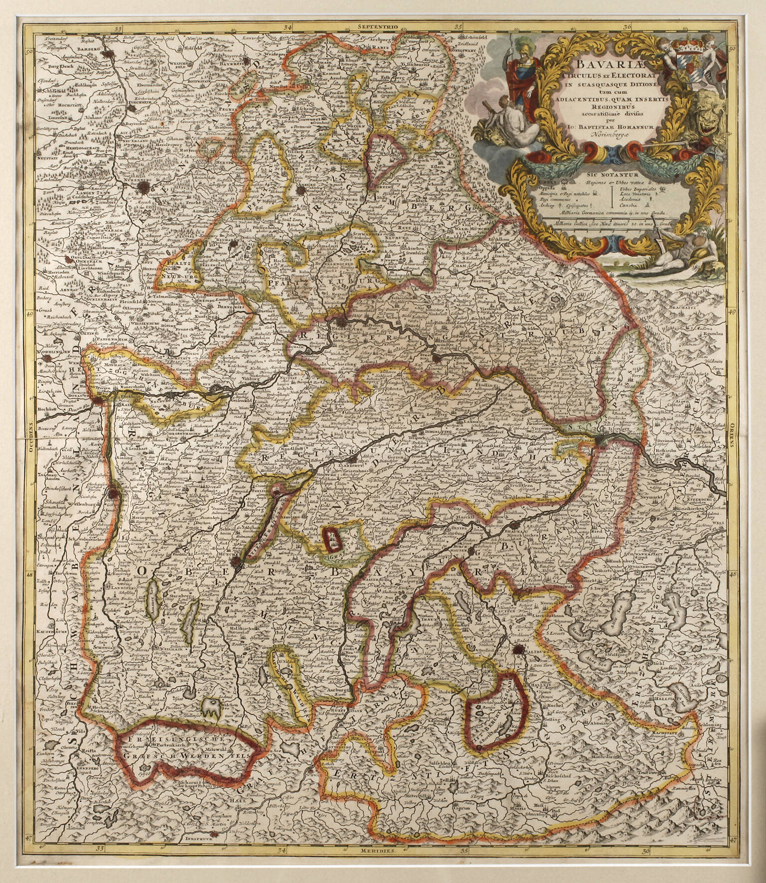 oben rechts prächtige figürliche Kartusche und hierin betitelt „Bavariae Circulus et Electorat in suasquasque Ditiones tam cum Adiacentibus quam Insertis Regionibus … Jo: Baptistam Homannum“, Darstellung des Gebietes zwischen Bayreuth im Norden, Wels im Osten, Innsbruck im Süden und Nördlingen im Westen, grenzkolorierter Kupferstich, um 1710, unter Passepartout und hinter Glas gerahmt, Darstellungsmaße ca. 56 x 47,5 cm. Künstlerinfo: dt. Kupferstecher, Verleger und Jesuit (1664 Kambach bis 1724 Nürnberg), vermutlich Schüler von David Funck, gründete um 1702 den eigenen Verlag "Homännisches Landkarten-Offizin", 1715 Mitglied der königlich preußischen Societät der Wissenschaften, Kaiser Karl VI. verlieh ihm den Titel eines "Kayserlichen Geographen" und der russische Zar Peter der Große ernannte Homann zum "Kayserlich russischen Agenten", tätig unter anderem in Wien, Leipzig und Nürnberg, Quelle: Thieme-Becker und Internet.