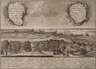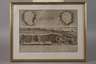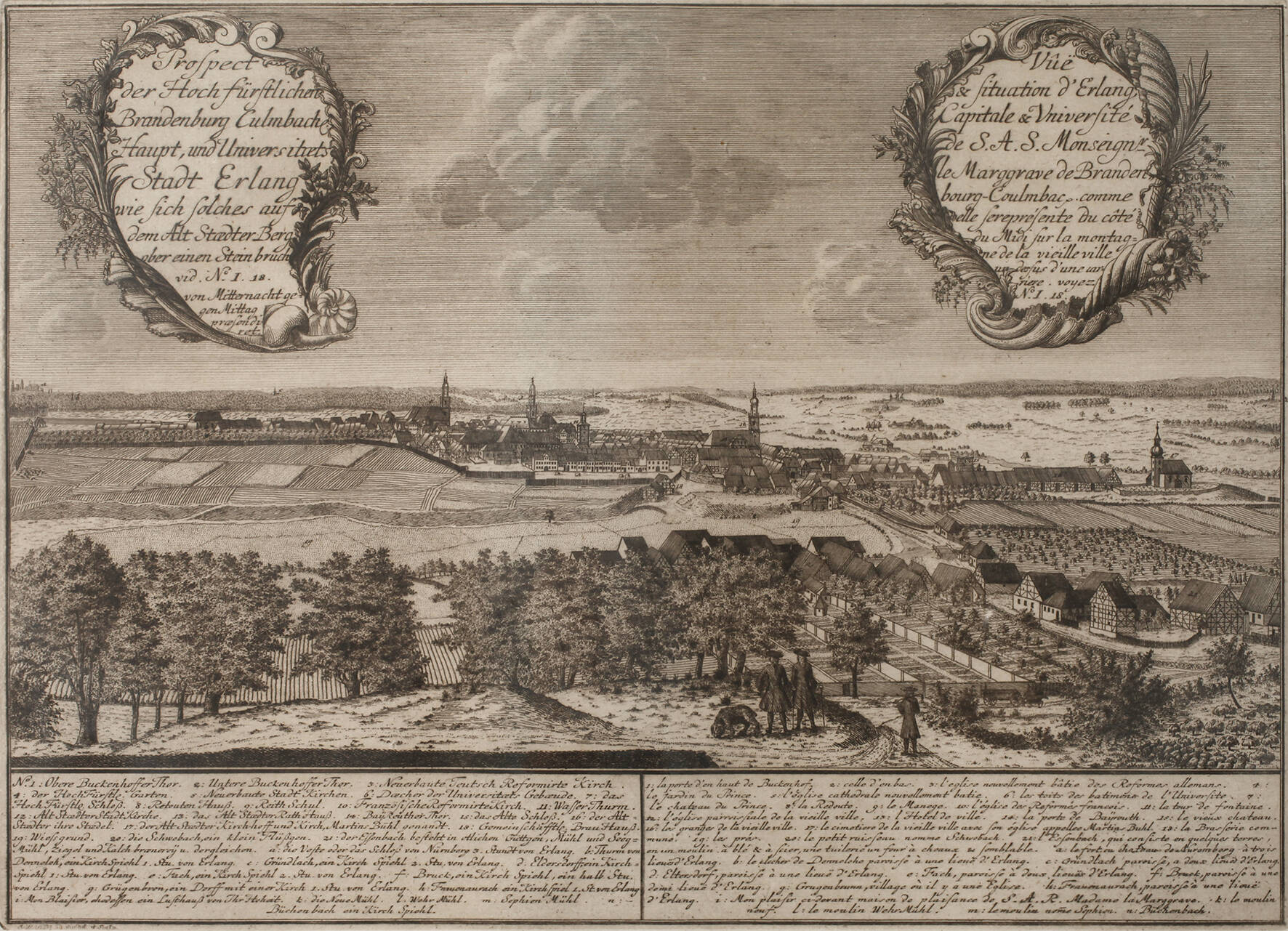Ansicht der Stadt Erlangen mit Figurenstaffage im Vordergrund, im Himmel zwei Kartuschen, in der linken bezeichnet „Prospect der Hochfürstlichen Brandenburg Culmbach Haupt, und Universitaets Stadt Erlangen ...“, unter der Darstellung Legende, Kupferstich, Abzug des 20. Jh., links unten in der Platte unleserliche Signatur, im Randbereich wasserrandig, hinter Glas gerahmt, Darstellungsmaße ca. 27,5 x 37,5 cm.