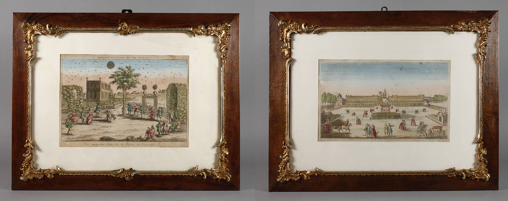 Darstellung einer spielenden höfischen Gesellschaft vor einem Wasserschloss und Ansicht des Platzes Louis des XV. in Paris mit Figurenstaffage, kolorierte Kupferstiche, 18. Jh., jeweils mit Verlegerangaben, unter der Darstellung kurze Legende „Vue perspective d´un Jeu de Bague en Eypagne“ und „ Vue perspective de la Place de Louis XV á Paris dont la Statue Equestre a eté Posée le 14 Fevrier 1763“, geringe Erhaltungsmängel, ansprechend unter Passepartout und hinter Glas jeweils in Rahmen mit Rocaillenverzierung gerahmt (mit geringen Verlusten), Darstellungsmaße max. ca. 26,5 x 41,5 cm.