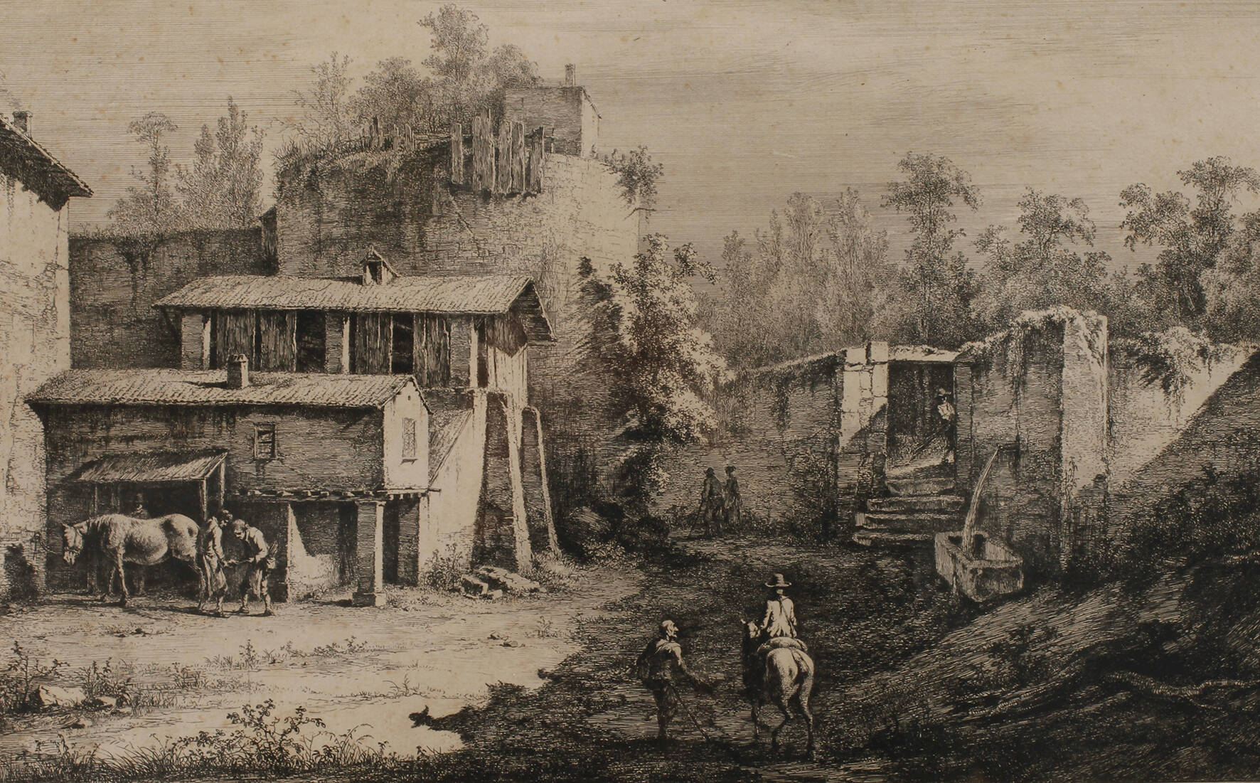 ländliche Szene mit verfallenen Häusern und Hufschmied, der seiner Arbeit nachgeht, Radierung, unter der Darstellung links monogrammiert und datiert „J. J. B. 1808“ und in Blei an der Blattkante rechts unten betitelt „Der Hufschmied“, braunfleckig, Darstellungsmaße ca. 18,8 x 30,3 cm. Künstlerinfo: französischer Maler, Zeichner, Kunsthändler und Kupferstecher (1736 Lyon bis 1810 Lyon), weitestgehend Autodidakt, studierte an der École gratuite de dessin in Lyon bei Lombard und Jean Charles Frontier, Schüler im Kupferstich bei Robert Menje Pariset, 1758–64 als Kupferstecher tätig, 1762–64 in Paris, hier beeinflusst von Johann Georg Wille, Joseph Vernet, Jean-Baptiste Greuze und Jacques Germain Soufflot, 1765–66 Italienaufenthalt im Gefolge des französischen Botschafters Louis Alexandre duc de La Rochefoucauld d’Enville, hier Bekanntschaft mit Voltaire, anschließend als Kupferstecher und Reproduktionsstecher in Lyon, ab 1771 Amt des Trésorier de France (Steuerbeamter) von Lyon, 1806–10 Bürgermeister von Lentilly/Département Rhone, Quelle: AKL, Thieme-Becker und Wikipedia.