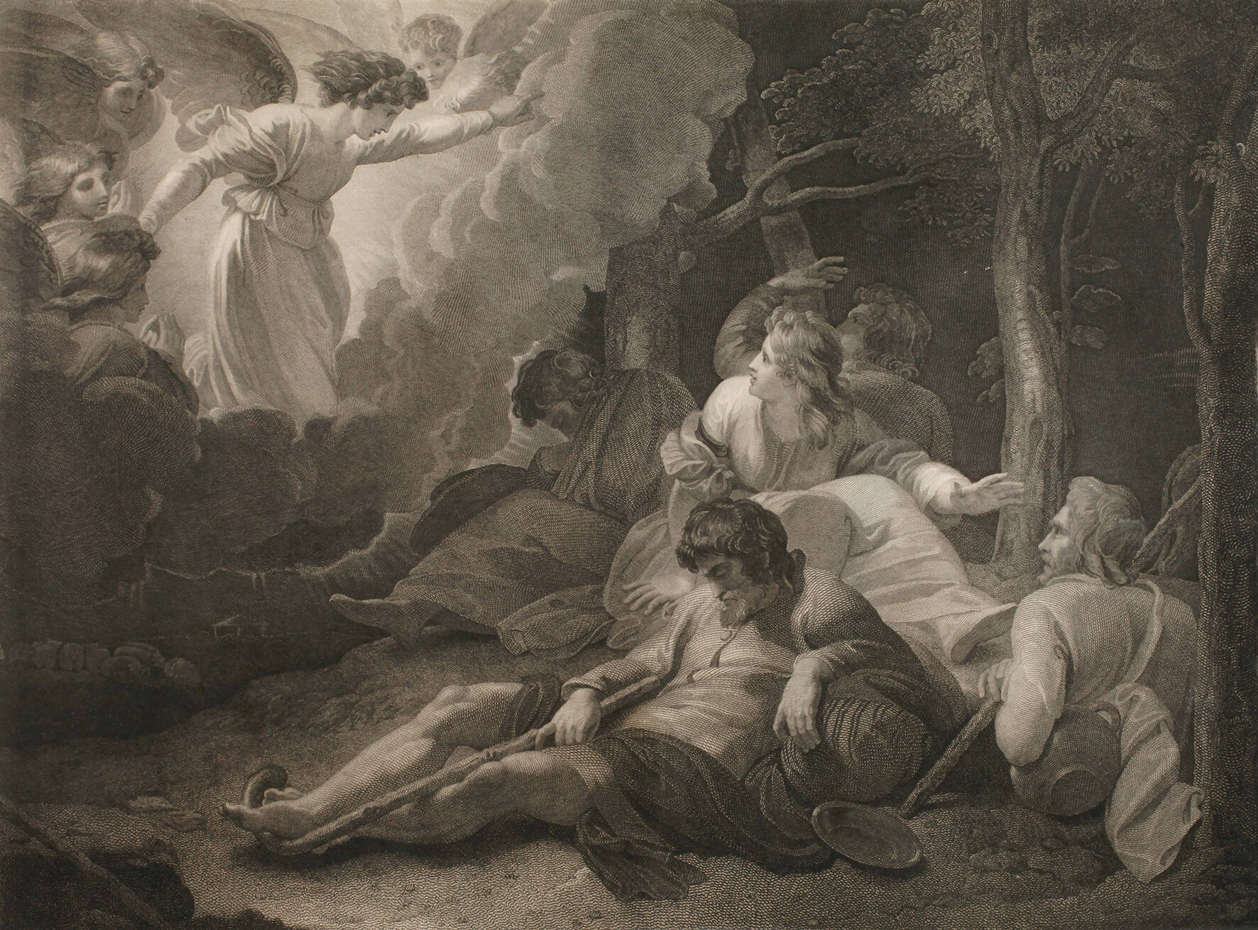 Frauen wecken die schlummernden Hirten, um die erscheinenden Engel zu sehen, Radierung, rechts unter der Darstellung bezeichnet „Engraved by William Skelton“ und mittig betitelt „The Angels appearing to the Shepherds“ und datiert „... July 15.1794 ...“, Erhaltungsmängel, hinter Glas gerahmt, Darstellungsmaße ohne Schrift ca. 43 x 58,5 cm. Künstlerinfo: engl. Kupferstecher (1763 London bis 1848 London), Bruder des Joseph Skelton, Studium an der Royal Academy bei James Basire und William Sharp, Quelle: Thieme-Becker und Wikipedia.
