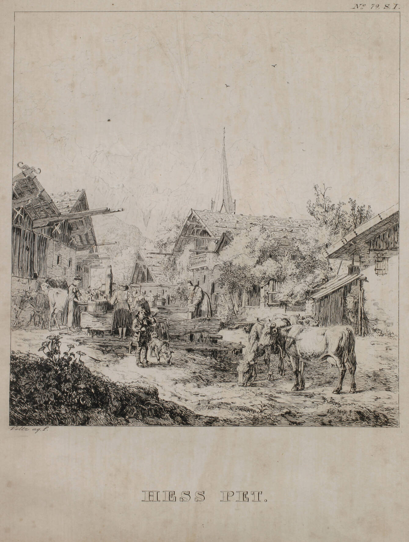 idyllischer Blick auf einen belebten und von urwüchsigen Häusern gesäumten Platz mit angedeutetem Bergpanorama im Hintergrund, nach Peter Hess, Radierung, unter der Darstellung und in der Platte links signiert „Voltz aq.f.“ und mittig bezeichnet „Hess Pet.“, in der Darstellung signiert und datiert „Peter Hess 1879“, leichte Altersspuren, unter Passepartout und hinter Glas gerahmt, Darstellungsmaße ohne Schrift 15,5 x 14,5 cm. Künstlerinfo: eigentlich Johann Friedrich Voltz, dt. Graphiker, Tier- und Landschaftsmaler (1817 Nördlingen bis 1886 München), zunächst Schüler seines Vaters Johann Michael Voltz (1784–1858) sowie tätig als Radierer und Lithograph, studierte ab 1834 an der Münchner Akademie, blieb jedoch weitestgehend Autodidakt, unternahm 1843–46 diverse Studienreisen zum Tierstudium zu württembergischen Gestüten und durch die bayerischen Hochgebirge, nach Oberitalien, Tirol, Belgien und Holland sowie nach Wien, Berlin und Paris, ab 1835 beeinflusst von Albrecht Adam, erhielt in Holland Anregungen durch Barend Cornelis Koekkoek sowie seit den 1850er Jahren von seinen Freunden Eduard Schleich dem Älteren und Carl Spitzweg, zunächst bis Anfang der 1840er Jahre vorwiegend Maler der bayerischen Alpen, anschließend Hinwendung zur Landschaftsmalerei mit Tierstaffage, vor allem Rindern, 1871 mit Schleich Studienreise nach Italien, ab 1864 Ehrenmitglied der Akademie München, 1869 Mitglied der Berliner Akademie und 1870 der Wiener Akademie, vertreten unter anderem in der Neuen Pinakothek München und der Berliner Nationalgalerie, erhielt diverse Ehrungen und wurde von König Ludwig II. 1863 mit den königlich bayrischen Professorentitel und 1867 mit dem Ritterkreuz 1. Klasse des bayrischen Verdienstordens vom Heiligen Michael bedacht, später Ehrung mit dem Roten Adlerorden, tätig in München, Quelle: Thieme-Becker, Matrikel der Münchner Akademie, Allgemeine Deutsche Biographie, Bruckmann "Münchner Maler des 19. Jh.", Seubert, Müller-Klunzinger, Müller-Singer, Boetticher und Wikipedia.
