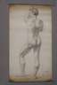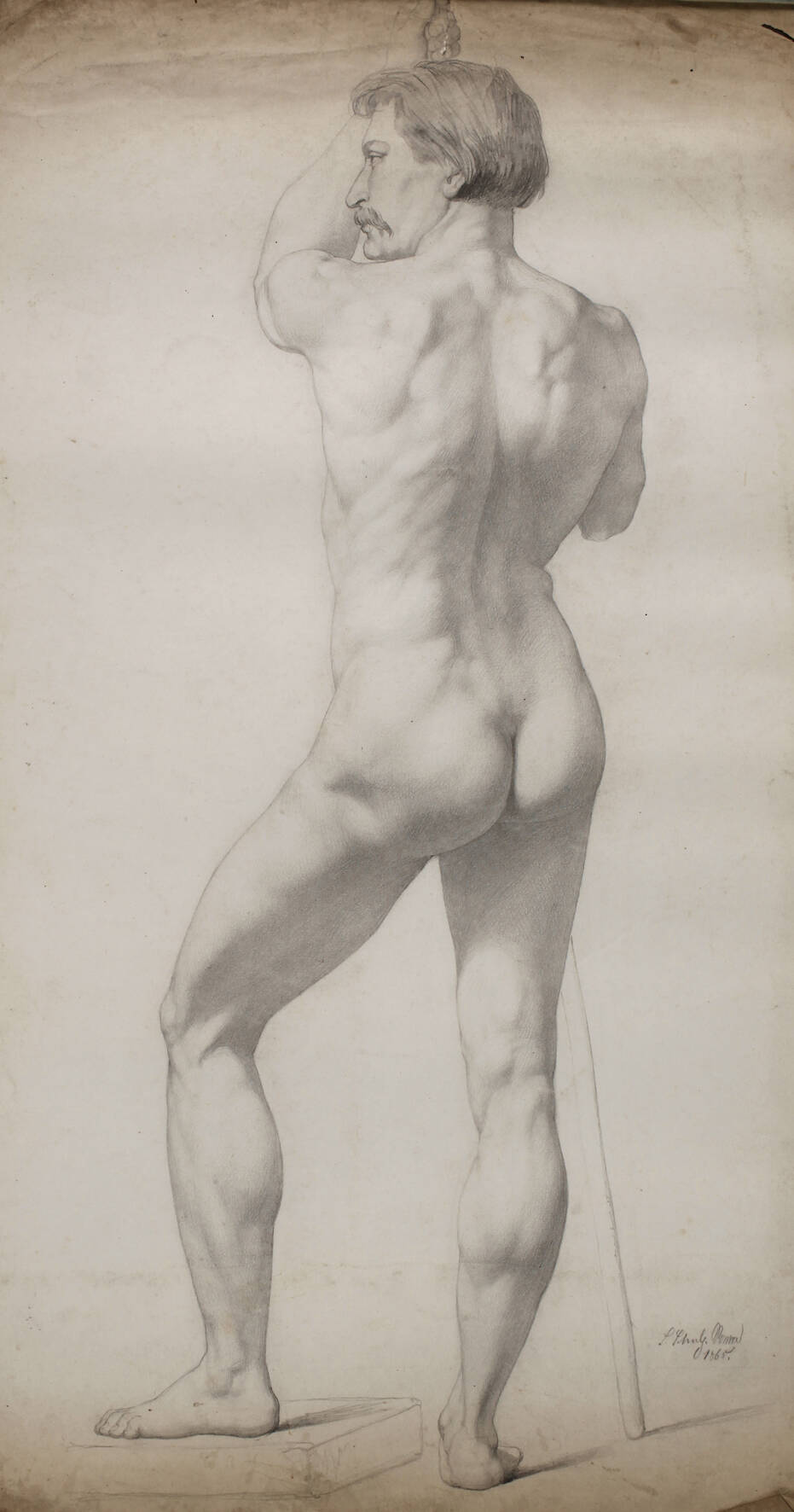 Rückenansicht eines nackten stehenden Mannes mit Stab, Bleistiftzeichnung, rechts unten signiert, bezeichnet und datiert „L. Schulz Roma 1865“, im Randbereich Erhaltungsmängel, gerollt, Blattmaße ca. 54 x 29,5 cm.