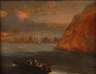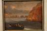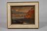 Blick vom Meer mit Boot auf die Steilküste und im Hintergrund kleine Siedlung an der Küste mit Segelschiffen, wohl Koloniendarstellung, lasierende Landschaftsmalerei, Öl auf Holztafel, 17./18. Jh., leichte Altersspuren, gerahmt, Falzmaße ca. 12,5 x 16 cm.