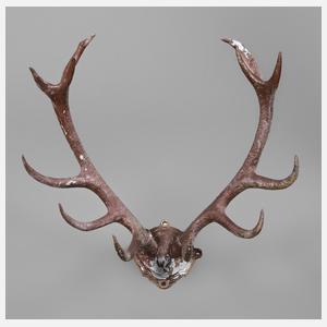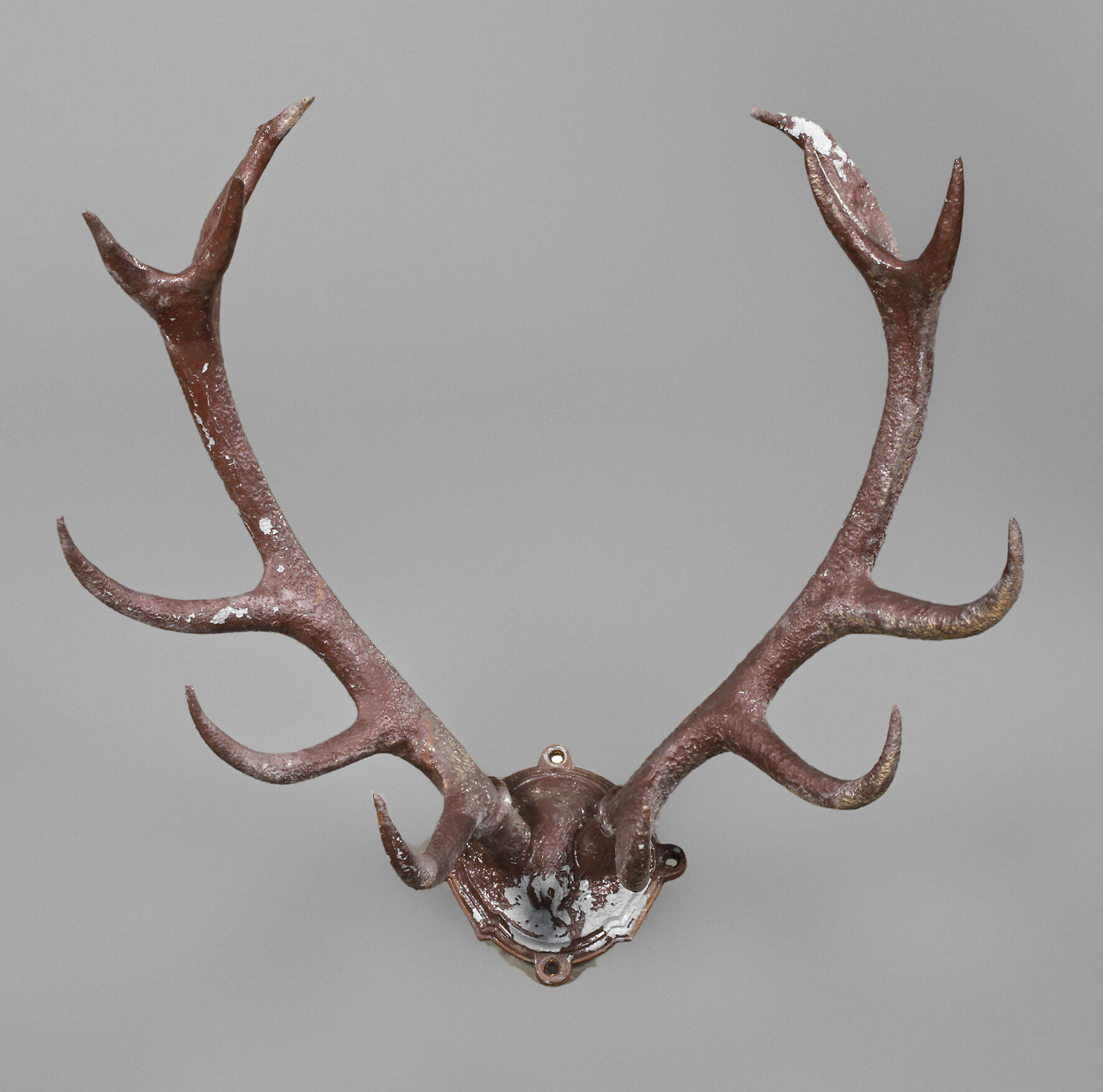 um 1890, Eisenguss, mehrteilig gearbeitet und montiert, farbig gefasst, plastisch als 10-Ender gefertigt, Farbverluste, laut Vorbesitzerangabe aus einem sächsischen Jagdschloss, H 90 cm.