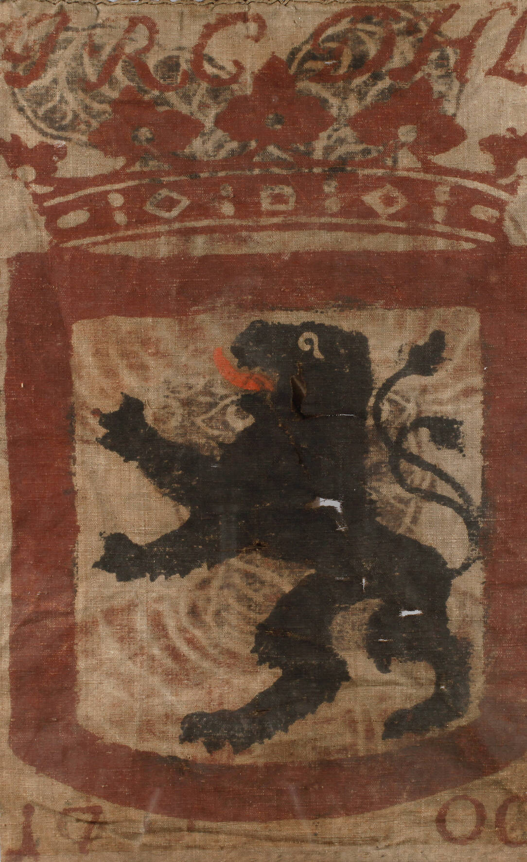 datiert 1700, Signatur des Johann Reinhard III. Graf (Comte) von Hanau-Lichtenberg, Wappenlöwe/Türkenkopf, Leinen, mittig Substanzverluste, Farben noch recht frisch erhalten, hinter Glas gerahmt, Maße ca. 65 x 41 cm.