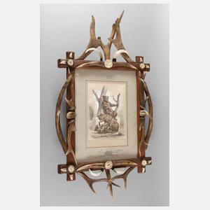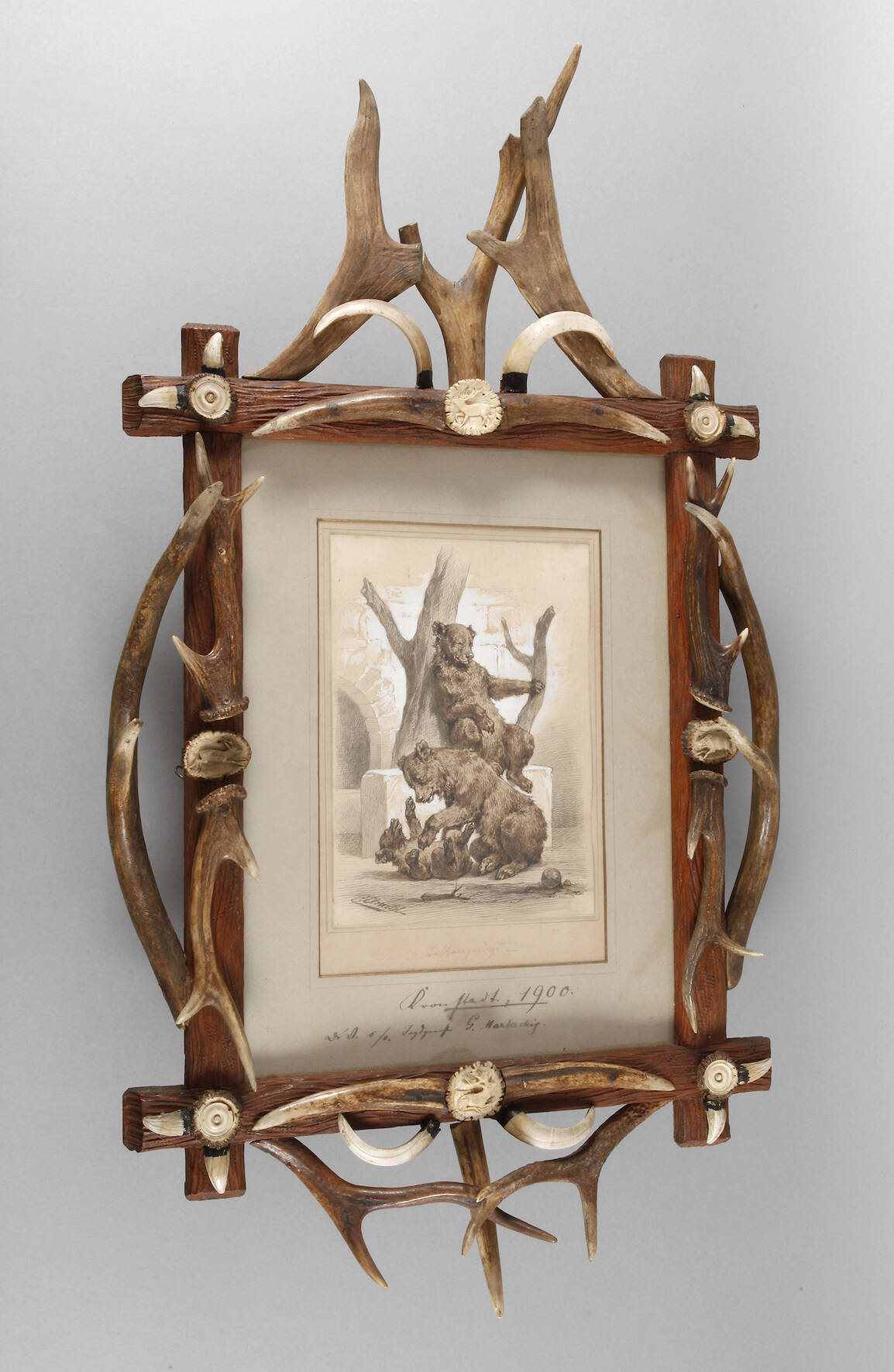 spielende Bären im Gehege, poesievolle, gekonnt erfasste Tierzeichnung, Mischtechnik (Tuschezeichnung in Schwarz und Sepia mit Weißhöhung in Gouache) auf getönten Papier, um 1890, links unten in der Zeichnung handsigniert "C. Arnold", Blatt freigestellt auf Karton, hier in Bleistift betitelt "Stillvergnügt", ins Passepartout geheftet, hier ortsbezeichnete und datierte Widmung "Kronstadt [rumänisch: Brașov], 1900 - ... s./v. [seinem verehrten] Jagdgenosse G. Mardersteig", der Adressat dieser wohl vom Künstler getätigten Dedikation und mithin Eigentümer vorliegender Zeichnung war Georg Mardersteig (1864 Weimar bis 1943 Weimar), welcher als passionierter Jäger, Rechtsanwalt und Justitzrat nach mehreren Publikationen zum Thema 1932 die moderne, deutsche Jagdgesetzgebung begründete, die im 1934 erlassenen Reichsjagdgesetz mündete und auf Grund ihrer fachlich fundierten und fortschrittlichen Formulierung in großen Teilen im Bundesjagdgesetz fortlebt, zusammen mit der Zeichnung des Tiermalers und Menzelschülers Carl Johann Arnold bildet das Objekt ein Rarissimum der deutschen Jagdgeschichte, Blatt gering fleckig, hinter Glas im prächtigen jagdlichen Holzrahmen mit applizierten teils gedrechselten bzw. mit jagdlichen Motiven beschnitzen Geweihrosen, Abwurfstangen, Grandeln und Wildschweinhauern, Blattmaße ca. 27,5 x 19,5 cm, lichte Rahmenmaße 43,5 x 32 cm. Künstlerinfo: eigentlich Carl Johann Arnold, dt. Maler, Zeichner, Illustrator und Graphiker (1829 Kassel bis 1916 Jena), Sohn und Schüler des Tapetenentwerfers, Tapetenfabrikanten, Landschafts- und Portraitmalers, Lithographen sowie Dekorateurs Carl Heinrich Arnold (1793-1874), zunächst in Kassel aufgewachsen, 1830-35 in Berlin, ab 1836 wieder in Kassel, frühe Förderung durch den mit dem Vater befreundeten Adolf von Menzel, war auf Einladung Menzels 1846 für 3 Monate dessen einziger Atelierschüler in Berlin und Menzel nannte ihm liebevoll "Carlchen", kurze Unterbrechung der Studien in Folge des Todes von Menzels Mutter, zeitweise Unterkunft und Unterricht beim Berliner Bildhauer Friedrich Drake, 1847-48 Besuch Menzels bei Arnold in Kassel, später Studium an der Akademie Kassel und zweijährige Weiterbildung in Antwerpen, ab 1853 auf Menzels Einladung erneut mit diesem in Berlin tätig, schuf hier über 100 "Zeichnungen nach dem Leben" von Kaiser Wilhelm I. und wurde von diesem 1886 zum Königlich preußischen Hofmaler ernannt, 1884 Berufung als Hofmaler nach Weimar, 1886-1913 in Weimar tätig, anschließend in Jena, schuf Beiträge für die populären Zeitschriften "Gartenlaube", "Illustrierte Zeitung" und "Über Land und Meer", Quelle: Thieme-Becker, Vollmer, AKL, Saur "Bio-Bibliographisches Künstlerlexikon", Dressler, Schmaling "Künstlerlexikon Hessen-Kassel 1777-2000", Müller-Singer, Boetticher, Carl Johann Arnold „Erinnerungen aus meinem Zusammenleben mit Adolph Menzel“ und Wikipedia.