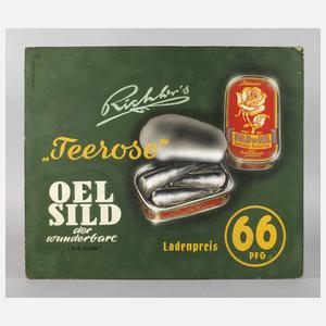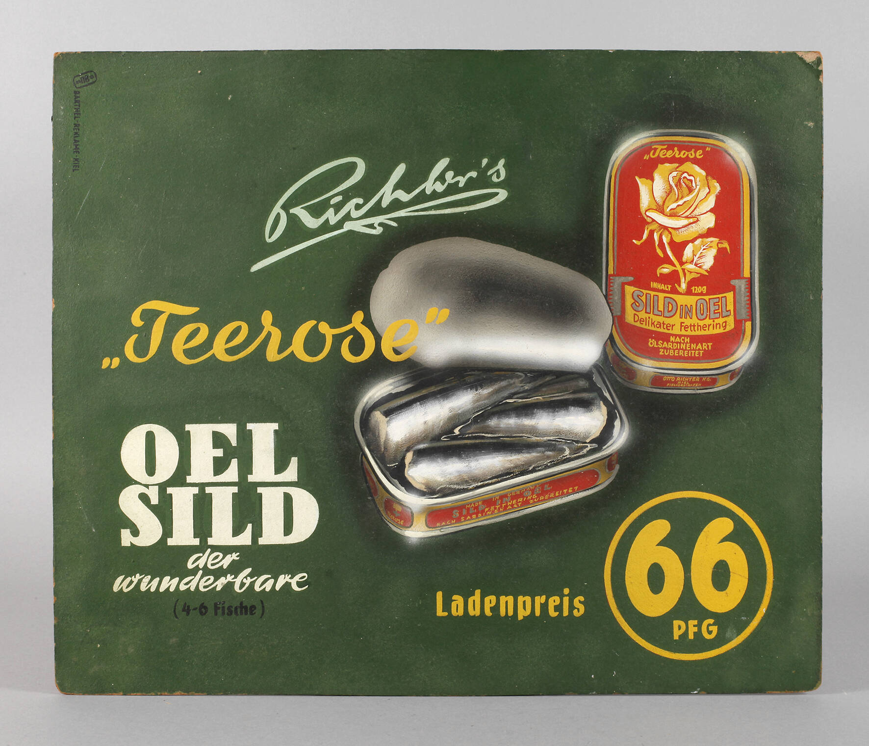 Werbung für Konserven von Hering nach Ölsardinenart, "Richters »Teerose« Oel Sild - der wunderbare (4-6 Fische), Ladenpreis 60 PFG", Öl auf Hartfaserplatte, um 1950, links oben bezeichnet "Barthel-Reklame Kiel", rückseitig altes Etikett "Dieses Plakat ist unverkäufliches Eigentum der Firma Otto Richter K. G. Kiel und darf nur für den vorgesehenen Zweck verwendet werden. Ich bitte um schonende Behandlung & wünsche Ihnen gute Verkaufserfolge ...", Randmängel, Maße ca. 50 x 59,5 cm.