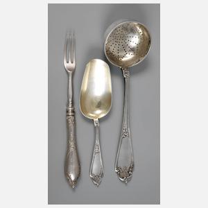 2. Hälfte 19. Jh., Silberstempel 84 Zolotniki, Schriftzug "Fabergé" mit Doppeladler, Teesieb und Zuckerlöffel mit vergoldeten Laffen, die Griffe verziert mit Rocaillemotiven, dazu eine Dessertgabel mit etwas anderem Dekor, normale Gebrauchs- und Altersspuren, L max. 17 cm, G ca. 135 g.
