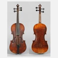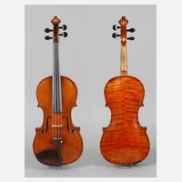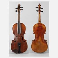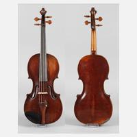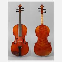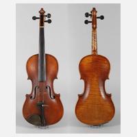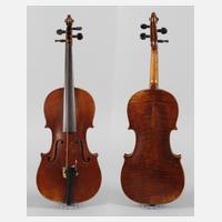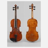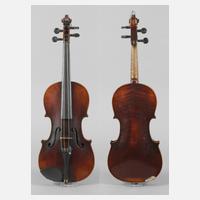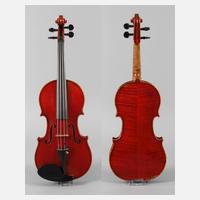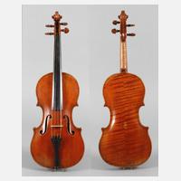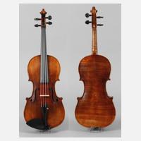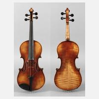 wohl Markneukirchen, auf Klebezettel bez. und datiert Wilhelm Brückner, Geigenbauer Erfurt 1906 sowie Reparaturetikett Max Renz, Geigenbauer in Magdeburg, repariert anno 1947, geteilter, sehr gleichmäßig geflammter Boden aus Spiegelahorn in rotbraunem Lack auf orangem Grund, umlaufende dreiteilige Randeinlage, rissfreie Decke aus feinjähriger Tonfichte, guter, spielbereiter Zustand, mit Bogen im Etui, L Korpus 35,8 cm.