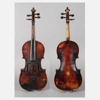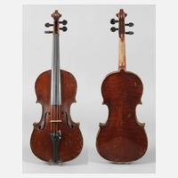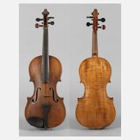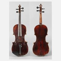 um 1920, mit Modellzettel Antonius Stradiuarius Cremonensis, geteilter, gleichmäßig geflammter Boden in haselnussbraunem Lack, mit geritztem Besitzernamen, umlaufend dreiteilige Randeinlage, Substanzverluste, alt repariert, restaurationsbedürftig, mit defektem Bogen im Kasten, L Korpus 35,6 cm.