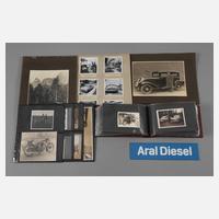 1930-1960, vorwiegend Schwarz-Weiß-Fotografien verschiedener Automodelle sowie Werbepostkarten, dazu schmales Emailschild Aral Diesel, zweifarbig emailliert, unterschiedliche Maße und Erhaltungen.