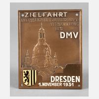 datiert 1931, Hersteller Gustav Brehmer Markneukirchen, Messing teils farbig emailliert, reliefiert mit Silhouette der Dresdner Frauenkirche, anlässlich der Jahreshauptversammlung des DMV, vier originale Bohrungen, Maße 8 x 6,5 cm.