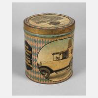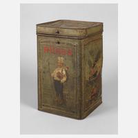 um 1915, Weißblech mehrfarbig lithografiert bzw. goldbronziert, zylindrische Dose mit abnehmbarem Deckel, Wandung umlaufend von Rautendekor durchmustert, Front und Rückseite mit Firmenumschrift der Konditorei Hülfert Dresden, welche weltweiten Versand von Baumkuchen und Christstollen anpreist, etwas berieben, Korrosionsspuren, Z 1–2, H 18 cm.