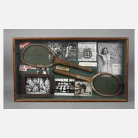 um 1920, verglaster Objektkasten mit Fotoabzügen und Zeitungsauszügen, zwei Tennisschlägern, u.a. der Firma Special sowie kleinem versilberten Pokal, Altersspuren, Maße ca. 65 x 100 x 10 cm.