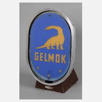 Mitte 20. Jh., unleserlich gemarkt, farbig gefasstes bzw. verchromtes Weißmetall, ovales Hinterglasschild mit Firmenschriftzug und Logo, einflammig elektrifiziert, nicht ganz komplett, Altersspuren, Z 2, H 47 cm.
