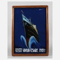 um 1910, bezeichnet Giulio Cesare Sud America Express, undeutlich signiert, mehrfarbige Hinterglasmalerei, welche den Überseedampfer Duilio zeigt, in schmaler Leiste gefasst, Altersspuren, Maße 58 x 42 cm.
