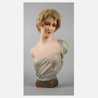 1920er Jahre, Stukko farbig gefasst, eingesetzte Glasaugen, angeklebte Wimpern, ergänzte Perücke, Wimpern nicht ganz komplett, minimale Farbabplatzer, H 67 cm.