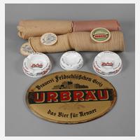 1930er Jahre, ovales Kunststoffschild, Hersteller Imoglas-Plakatefabrik Barmen-Wuppertal, mit Fabrikansicht und Umschrift, dazu drei Porzellanascher sowie zahlreiche verschiedene Bierdeckel, unterschiedliche Maße und Erhaltungen, L max. 45 cm.