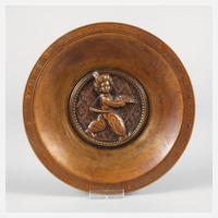 Mitte 20. Jh., gemarkt Noack Berlin, von Julius E. F. Gipkens, 1883–1968, Bronze bräunlich patiniert, gemuldeter Teller, im Spiegel reliefierte Darstellung des Sarotti-Mohren, in der Fahne mit Umschrift „Unserem Jubilar Josef Knopp als ehrende Anerkennung für 25jährige treue Tätigkeit, Sarotti, 4.9.1976“, D 20 cm.