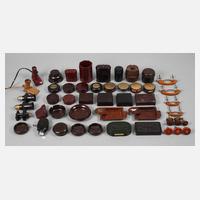 1930er Jahre, mit diversen Werbeaufschriften Geha, Pelikan, Braun, Kores und Tramp, Schachteln, Griffe, Knäufe, Aschenbecher, Lampenfassungen, eine Taschenlampe mit Dynamo und ein Mahlwerk, Gebrauchs- und Altersspuren, H max. 10 cm.