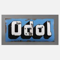 um 1930, ungemarkt, langrechteckiges, stark gewölbtes Schild, dreifarbig emailliert, spätere Befestigungsbohrungen, größere Fehlstellen, Korrosionsspuren, Maße 60 x 120 cm.