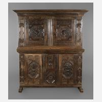 Raum Nürnberg, 17. Jh., Eiche massiv, reich beschnitzt, zweiteiliger Korpus, unter dem Gesims Inschrift "Jungfer Charlotte Elsabein Mainersmanns 1675", Unterteil mit zwei großen und einer kleinen Tür, innen je ein feststehender Regalboden, der zweitürige Aufsatz mit zwei Tellerbords, alle Türen mit aufwendiger profilierter Kassettenfüllung und teils figürlicher Reliefschnitzerei, dazwischen aufwendige Schuppenleisten und Rosetten, im 19. Jh. restauriert und teilweise ergänzt, Schlösser erneuert, eine Zierleiste locker, zwei fehlen, zum Teil stärkere Alters- und Gebrauchsspuren, Maße 210 x 175 x 60 cm