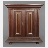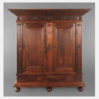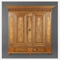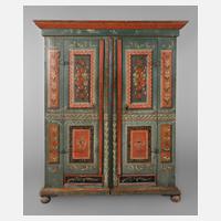 1. Hälfte 18. Jh., komplett zerlegbarer, zweitüriger Schrank aus Nadelholz, in Bierfarbe vermutlich im 19. Jh. gefasst, partiell in Rot, Grün und Gelb abgesetzt, weit ausladendes, stark profiliertes Gesims und Sockel, später angefertigte Inneneinrichtung mit sieben Regalböden und Kleiderhaken, originales Schloss, Schlüssel nicht passend, Alters- und Gebrauchsspuren, Maße 204 x 198 x 80 cm.
