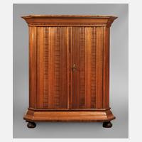 Nussbaum massiv, 2. Hälfte 18. Jh., zweitüriger Korpus mit abgeschrägten Ecken und geschwungenem Giebel, mittig teilbarer Kleiderschrank, die gerahmte Front mit geometrischen Einlegearbeiten in Mahagoni und Ahorn, Sockel mit intarsiertem Sternmotiv, originales Schloss und Schlüssel, Schlossplatte aus Messing mit graviertem Blumenmotiv, Inneneinrichtung mit fünf feststehenden und drei an Zahnleiste höhenverstellbaren Einlegeböden, alt restauriert, Maße 217 x 184 x 50 cm.