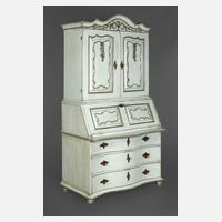 Eiche massiv, später hellblau gefasst, um 1800, die Schnitzerei grau konturiert, zweiteiliger Korpus, das Unterteil zweifach gebaucht, mit leicht überstehender Platte, darüber Schrägklappe, Inneneinrichtung mit acht Schüben, mittig mit großem Geheimfach, Aufsatz mit 14 Schüben und originaler verspiegelter Rückwand, zwei Zierleisten lose beigegeben, original Schlösser und Schlüssel, alt restauriert, Maße 216 x 116 x 74 cm.