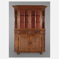 Ende 18. Jh., zweiteiliger Korpus aus massiver Eiche mit abgeschrägten Ecken, die Türen mit feiner Versprossung, dahinter zwei feststehende Einlegeböden, das zweitürige Unterteil mit floral geschnitzten Türfüllungen, originale Messingbeschläge, Alters- und Gebrauchsspuren, eine Scheibe defekt, Maße 218 x 135 x 41 cm.