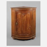Eiche massiv, Mitte 18. Jh., viertelkreisförmige Front, Zarge und Lisenen ornamental beschnitzt, Sockel und Simsleiste mittig leicht vorspringend, Schloss ergänzt, innen zwei feste Einlegeböden und Halterung für Gläser, Füße und Sockel lose beigegeben, restaurierungsbedürftig, Maße 106 x 85 x 60 cm.