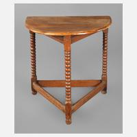 Nussbaum und Eiche massiv, 18. Jh., dreieckiges Untergestell mit gedrechselten Beinen, darauf spätere Platte aus massivem Nussbaum mit profiliertem Rand, Maße 78 x 78 x 53 cm.