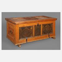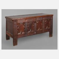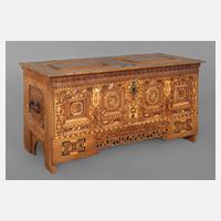 datiert 1782, Eiche massiv, mit reichen Einlegearbeiten in Ahorn, Ebenholz, Rüster und Nussbaum, Front mit acht aufwendigen Kassettenfüllungen, die beiden äußeren mit intarsiertem Vogelmotiv, seitlich schmiedeeiserne Tragehenkel, Deckel mit zwei Kassetten und Sternmotiv, innen Beilade mit Geheimfach, Schloss und Bänder aufwendig verziert, wohnfertig restauriert, mit Schlüssel, Maße 82 x 168 x 63 cm.