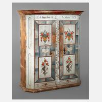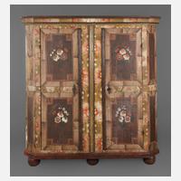 datiert 1820, Nadelholz massiv, mit aufwendiger Malerei verziert, zerlegbarer zweitüriger Schrank mit zwei Schubkästen und aufgesetzten schmiedeeisernen Beschlägen, innen drei später eingebaute Regalböden, alt restauriert, Rückwand erneuert, Schlüssel fehlt, Maße 191 x 163 x 65 cm.