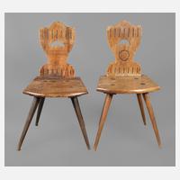 um 1780, Nussbaum massiv, vorn abgerundete trapezförmige Sitzfläche, die Lehne in Wappenform mit sichelförmigem Eingriff, stabiler Zustand mit Alters- und Gebrauchsspuren, Maße je 90 x 46 x 39 cm.