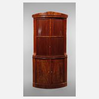 wohl Berlin, Mahagoni auf Eiche furniert, um 1820, zweiteiliger, viertelkreisförmiger Eckschrank, das Unterteil mit zwei Türen, Oberteil mit horizontalem Rolladenverschluss, jeweils mit einem Einlegeboden, Schloss des Unterteils fehlt, kleinere Furnierfehlstellen, Altersspuren, Maße 223 x 85 x 85 cm.