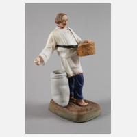 Dmitrovskaya Porzellanfabrik in Verbilki/Moskau, blaue Stempelmarke 1925-1932, Prägenummer 32, Biskuitporzellan mit polychromer Aufglasurbemalung, auf rechteckigem Natursockel schreitender Mann, in bäuerlicher Kleidung mit offenem Sack und Korb, zur Aufnahme von Kleinteilen (Schreibtischaufsatz), fachmännisch restauriert, H 17 cm.