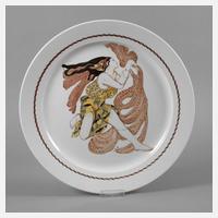 nach 1911, Pressmarke der Porzellanmanufaktur Kusnezow und gepinselte Bezeichnung in Kyrillisch, gewölbte Form mit glattem Rand, im Spiegel Darstellung einer tanzenden Mänade in erdfarbener Aufglasurmalerei, nach einer Kostümzeichnung für Tcherepnins Ballett „Narcisse“ von Leon Bakst 1911, am Rand zwei kleine Chips, D 42,5 cm.