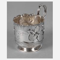 datiert 17.09.(18)99, monogrammiert "KM"?, Kokoschnikmarke, ungedeutete Meistermarke in kyrillisch, handgetrieben und fein ausgearbeitet, mit Wellenmotiven und Seerosenblättern, der Mündungsrand muschelartig geformt, zweigeteilter Henkel, sehr schöner altersgemäßer Zustand, geputzt, H 9 cm, G ca. 138 g.