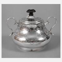 Beschaumeistermarke "B.C 1874", Silberstempel 84 Zolotniki, Stadtmarke Georg der Drachentöter für Moskau, kyrillische Meisterpunze "LWW", fein floral gravierte Zuckerdose mit Ohrenhenkeln und rückseitig scharniertem Klappdeckel, geschnitzter Ebenholzknauf, sehr schöner altersgemäßer Zustand, D 15,5 cm, G ca. 310 g.