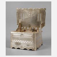 datiert 1867, Stadtmarke Moskau, Beschaumeistermarke "B.C", Silberstempel 84 Zolotniki, Meisterpunze Pavel Ovchinnikov, tätig in Moskau 1853–1916, traditionelle feine Gravur, Reste alter Vergoldung, Deckel fehlt, Altersspuren, H 10 cm, G ca. 149 g.