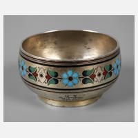 um 1920, Silber gestempelt 84 Zolotniki, Stadtmarke St. Petersburg, Meisterpunze "HK", graviertes Besitzermonogramm "MB", umlaufend ein emailliertes Blütenband, Reste alter Vergoldung, D 5 cm, G ca. 35 g.