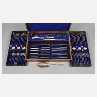 datiert 1886, russische Beschaumeister-Meisterpunze Leningrad, Silberstempel 84 Zolotniki sowie Stadtmarke, Meisterpunze KP, ligiertes Besitzermonogramm mit Krone in feinster Gravur, Menübesteck und Abendbrotbesteck für jeweils zwölf Personen, Messerklingen gestempelt Barbuinaew, dazu sechs Salieren mit passenden Löffelchen und fünf Vorlegeteilen, alles im originalen mit blauem Samt ausgeschlagenen Holzkasten, dieser mit aufgeschraubtem Messingschild, darauf ebenfalls das Besitzermonogramm, kaum Gebrauchsspuren, der Kasten innen jedoch fleckig, G total ca. 6057 g.