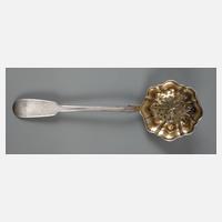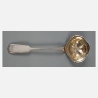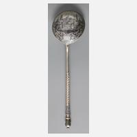 datiert 1858, Silberstempel 84 Zolotniki, Meisterpunze "L.K" im Rechteck, ungedeutete Stadtmarke, blütenförmig gestaltete, durchbrochene Laffe mit Resten alter Vergoldung, altersgemäßer Zustand ohne Beschädigungen, L 20,5 cm, G ca. 47 g.