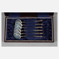 Moskau, um 1910, gestempelt 88 Zolotniki, Stadtmarke Moskau Georg der Drachentöter, Meistermarke HA, evtl. Ivan Alexeyev, tätig in Moskau 1876-1912, runde vergoldete Laffen, schlanker, gedreht-gerippter Griff, die Griffenden weiß und transluzid emailliert, die Laffenrückseiten mit ornamental aufgelegtem gekordelten Silberdraht und weißen Emailpunkten, im Etui, G ca. 84 g.