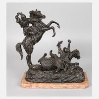 Ende 19. Jh., signiert E. Lanceray, Gießereimarke F. Chopin (St. Petersburg), Bronze dunkel patiniert, zwei in einen Zweikampf verwickelte Reiter, einer mitsamt Pferd am Boden liegend, sich verteidigend, der andere auf seinem steigenden Tier angreifend, beide in osmanischer Kampfaufmachung, beide Schwerter fehlen, sonst gute altersgemäße Erhaltung, Sockel später, H Bronze ca. 36,5 cm, H gesamt ca. 38,7 cm. Künstlerinfo: russischer Bildhauer (1848 Morschansk bis 1886 Charkiw), die Familie kam aus Frankreich nach Russland, studierte unter Nikolai Iwanowitsch Lieberich, spezialisiert auf Pferde und Reiter, schuf über 400 Skulpturen dieses Themas, bereiste das innere, europäische und asiatische Russland auf der Suche nach Inspirationen, arbeitet mit mehrere Gießereien wie Felix Chopin, Stange und Tula, Quelle: Internet.